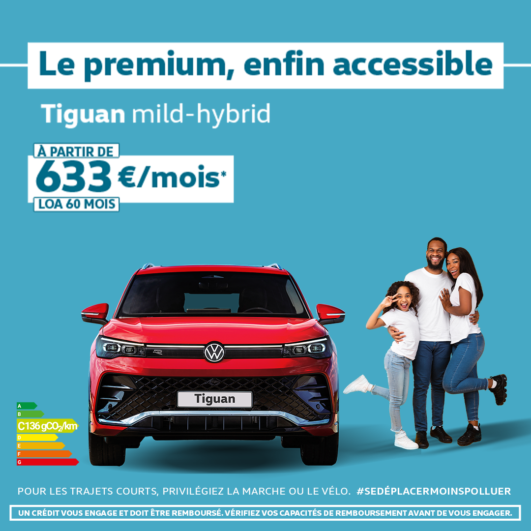 Tiguan VW Edition mild-hybrid 1.5L eTSI 131CH DSG 7 consommation mixte 5.9 L / 100 km neuf en LOA avec option d'achat de 48500€ d'une durée de 60 mois et d'un kilométrage de 75000 km, 1er loyer de 5000€ suivi de 59 loyers mensuels de 633€ hors assurance facultative, option d'achat finale de 19779€, soit un montant total dú sans option d'achat finale de 42522€ hors assurance facultative (dont 217,5€ de frais de dossier). Montant total dû avec option d'achat finale de 62301€ hors assurance facultative (dont 217,5€ de frais de dossier). Le coût mensuel de l'assurance facultative Décès, Perte Totale et Irréversible d'Autonomie, Incapacité Temporaire Totale de travail, souscrite auprès de Cardif Assurance Vie et Cardif Assurance Risques Divers, est de 49,59€ par mois qui s'ajoute au montant du loyer ci-dessus. Coût total de l'assurance facultative : 2926€. Offre promotionnelle valable jusqu'au 31/12/2025. Offre réservée aux particuliers (hors options, hors frais d’immatriculation, hors frais de service). Offre non cumulable avec toute autre offre pendant la période indiquée. Dans la limite des stocks disponibles et sous réserve d’acceptation du dossier par le Crédit moderne Antilles Guyane SA au capital de 18 727 232€ siège social immeuble Le Sémaphore, ZAC Houelbourg SUD 2, ZI Jarry, Rue René Rabat, 97122 Baie-Mahault – RCS Pointe à pitre 341 891 653 – N° Orias 07 027 944 (Ajowww.orias.fr) Consommation mixte WLTP 1.5L/100 km rejet de CO2 WLTP 136g/km. Photo non contractuelle